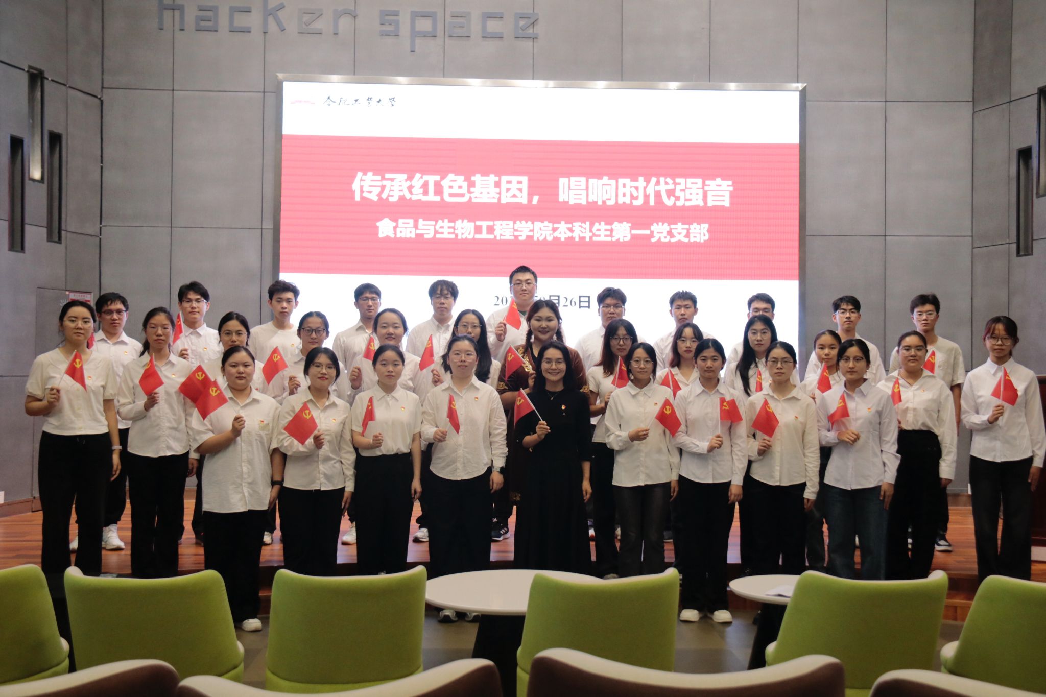 时值国庆、校庆和院庆重要时间点,紧扣“忆院情、学校史、颂祖国”主线,以红歌为媒,串联校史、院情与家国记忆,9月26日下午,食品与生物工程学院本科生第一党支部在翡翠湖校区大数据中心组织举办了“传承红色基因,唱响时代强音”特色主题党日活动。支部全体党员和部分发展对象、入党积极分子共计34人参加了活动,活动由支部组织委员李静主持。此次活动共分四个环节。在庄严的国歌声中,活动正式拉开帷幕。在红歌领学环节,支...