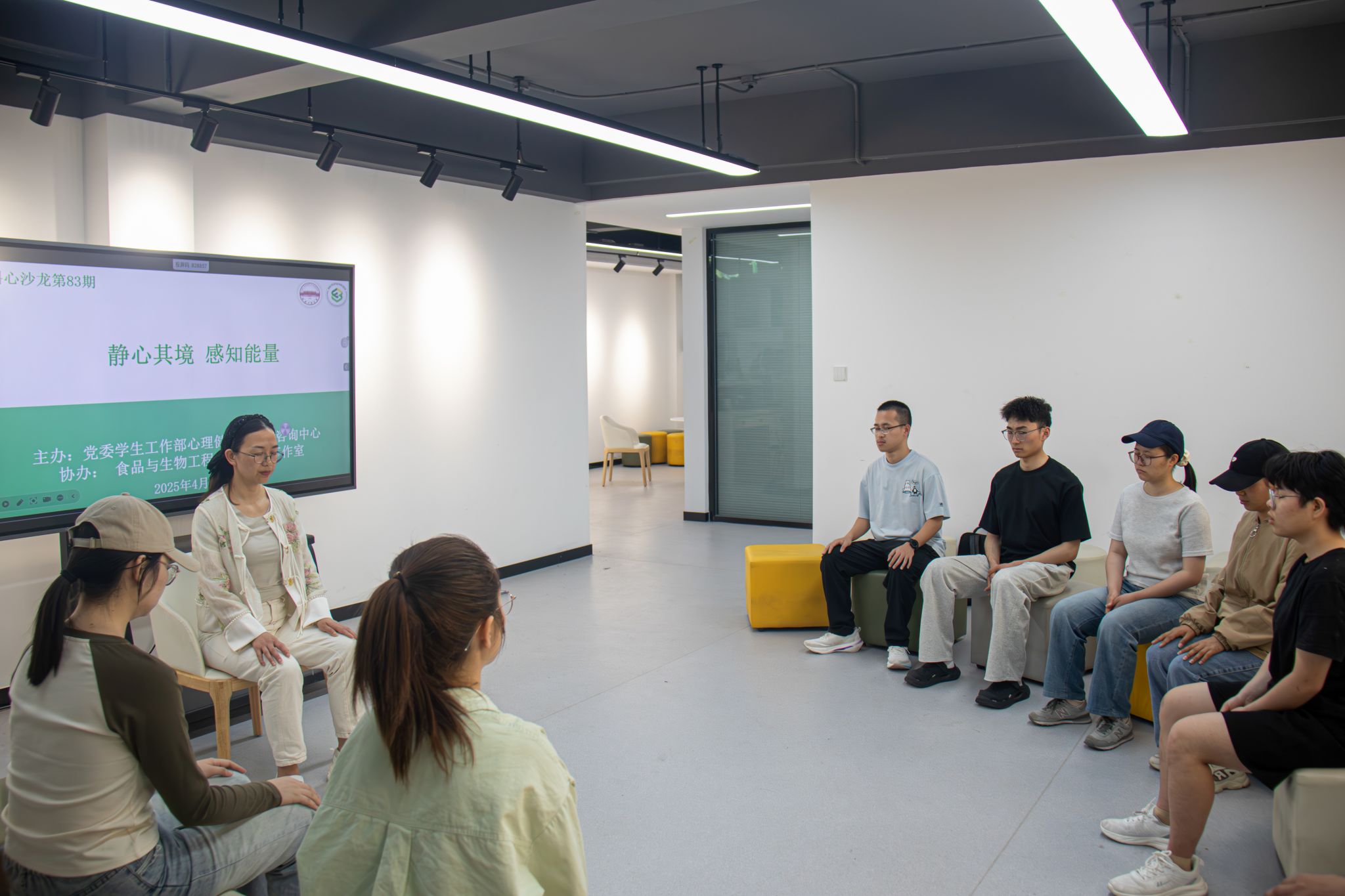4月26日晚19:00,食品与生物工程学院在翡翠湖校区6号宿舍楼学生社区沙龙空间举办斛心沙龙第83期(本科生专场)活动,主题为“静心其境 感知能量”,20余名本科生参与其中。本次沙龙由安徽省心理卫生协会理事金曼主讲,聚焦冥想主题,通过多元环节助力学生身心成长。