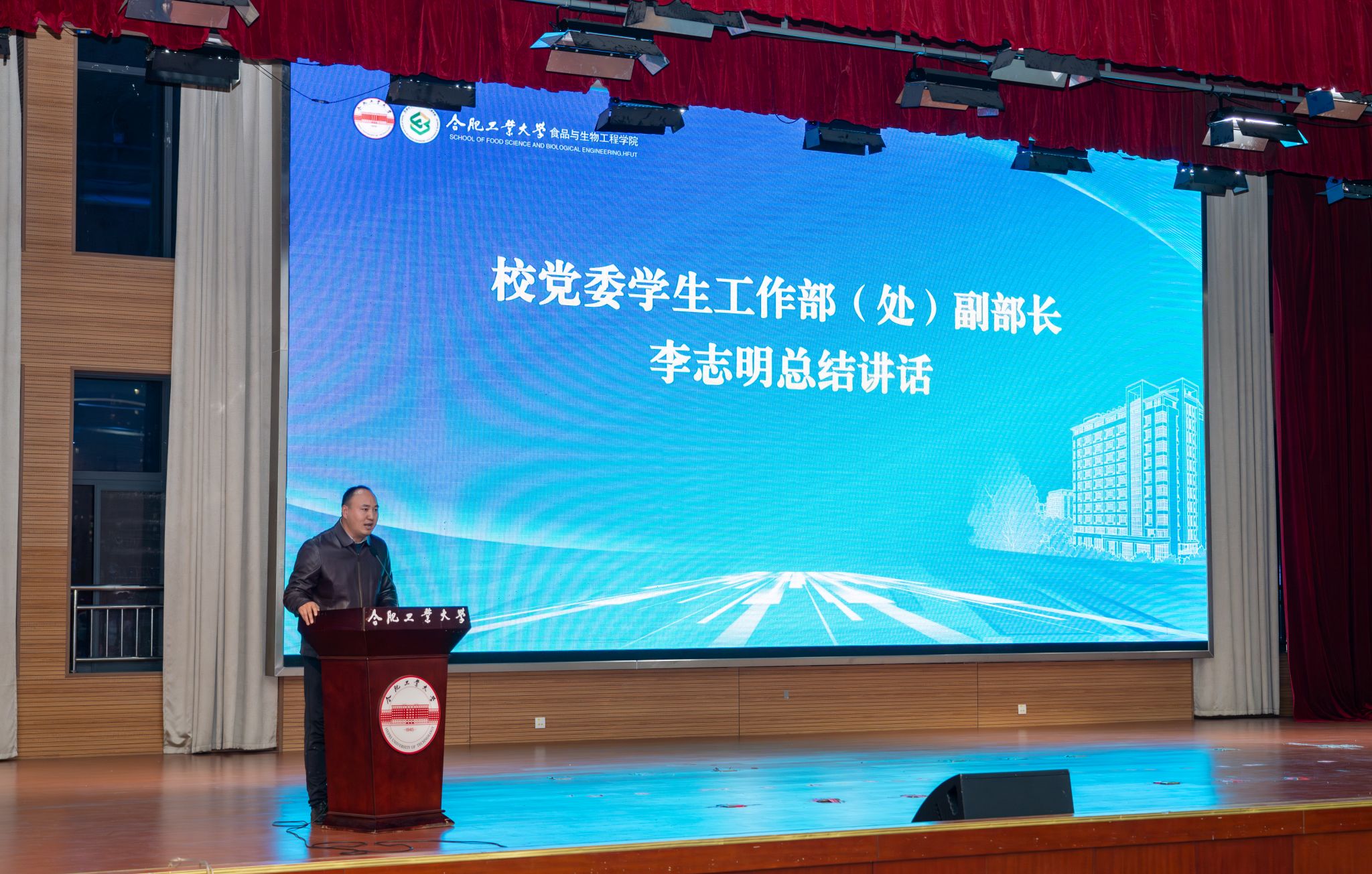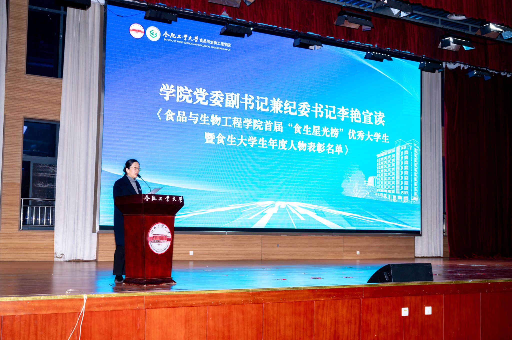 12月8日晚,食品与生物工程学院首届“食生星光榜”颁奖仪式暨“食生菁英”宣讲团巡讲首讲活动在合肥工业大学翡翠湖校区科教楼二楼大报告厅隆重举行。学院党委书记孙彩霞,校党委学生工作部副部长李志明,学院党委副书记兼纪委书记李艳,建筑与艺术学院党委副书记兼纪委书记任颖,学院全体辅导员、班主任代表及学生600人,共同参加了此次活动。