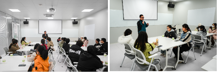 在交流互动环节中,老乡鸡中央厨房高级工程师程太平、李从武,副班长程成,以合肥工业大学校友的身份,为同学们介绍了老乡鸡的发展现状与未来规划,并结合个人成长经历,引导同学们要把学习摆在第一位,尽早开展职业探索,为同学们的未来发展提拱了宝贵经验。
