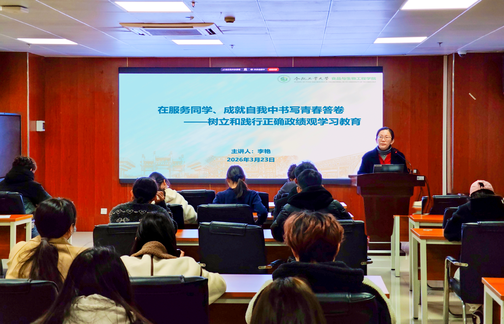 为认真贯彻落实党的二十届四中全会精神,扎实开展树立和践行正确政绩观学习教育,3月23日晚,食品与生物工程学院在食生楼206开展主题为“在服务同学、成就自我中书写青春答卷——树立和践行正确政绩观学习教育”主题党课。此次党课由学院党委副书记兼纪委书记李艳讲授,学院党员代表近百人参加学习。