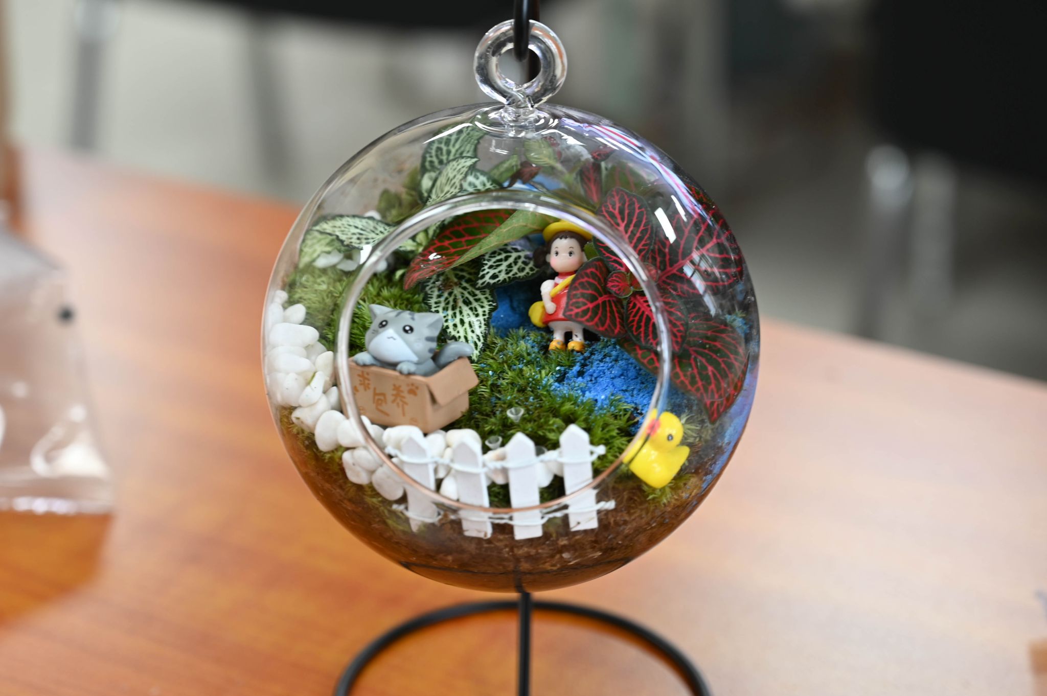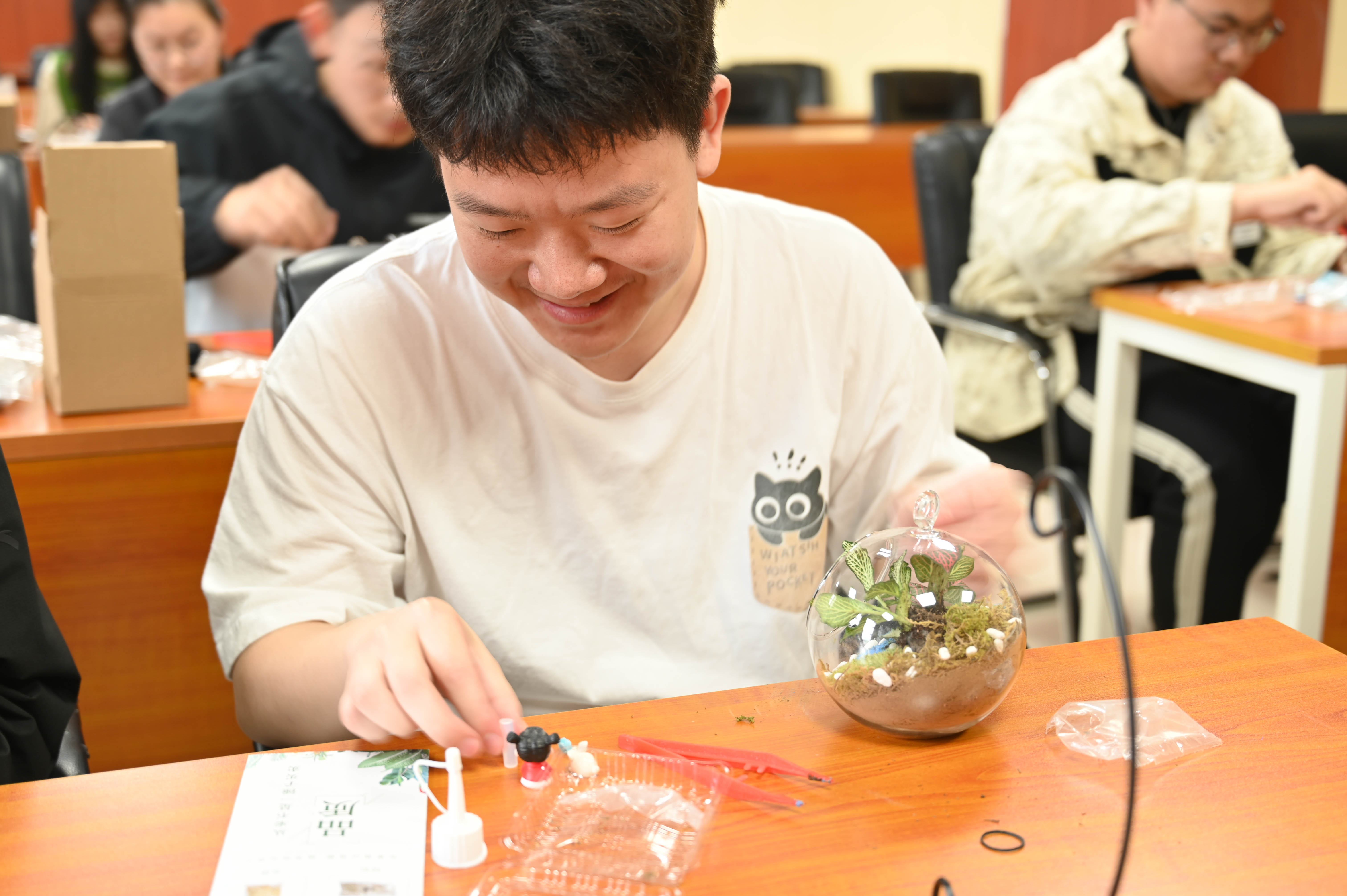 活动伊始,努尔比耶姆介绍了园艺疗法“静心凝神、疗愈情绪”的理念,从苔藓的静谧到蕨类的生机,引导同学们在绿意中感受自然疗愈的力量。接着,她带领同学们学习了微景观瓶的制作流程和技巧后,开启了一场充满创意与趣味的心灵之旅。随后,同学们充分发挥想象力与创造力,以苔藓、蕨类等绿植为媒介,在砾石与陶粒的基底上铺展生态画卷。从基质铺设到绿植搭配,从细节雕琢到整体构思,同学们以指尖触碰自然的温度,在一铲一植中沉淀心绪,将散落的材料凝练为微缩的绿色世界。
