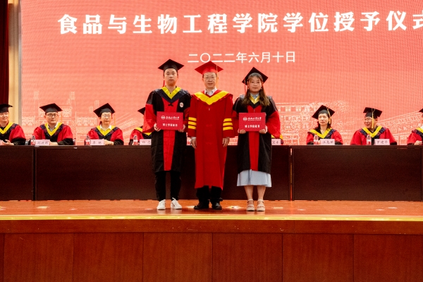 仪式在庄严隆重的国歌声中拉开序幕,食品与生物工程学院院长、学院学位分委员会主任徐宝才教授宣读了《关于授予食品与生物工程学院2022届毕业生学位的决定》,校、院领导老师为全体学位获得者扶正流苏、颁发学位证书并合影留念。