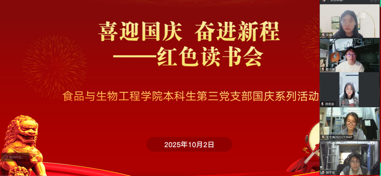 为庆祝中华人民共和国成立76周年,厚植爱国情怀,凝聚奋进力量,10月1日-10月8日,食品与生物工程学院本科生第三党支部组织学生党员开展红色读书会、“我与国旗合张影”“写给祖国的三行诗”等系列活动。