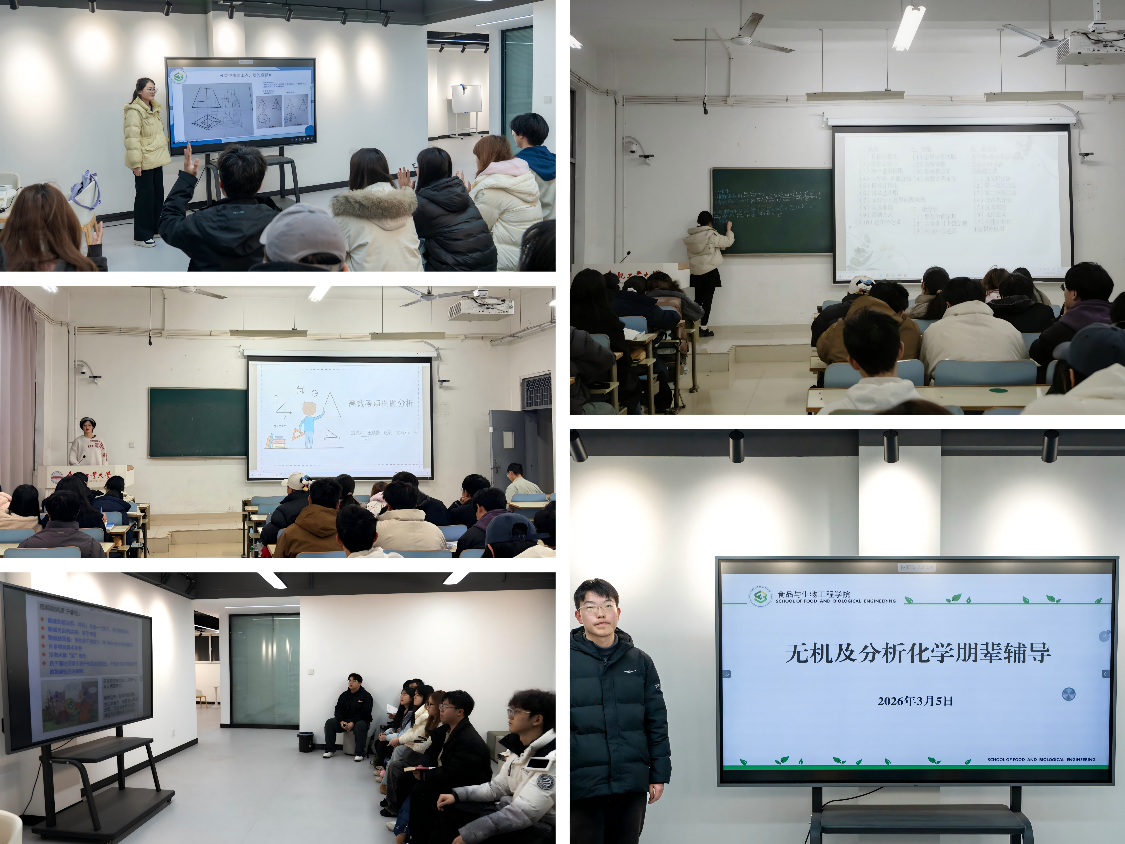 为切实加强学风建设,帮助学生克服学习困难、增强学习信心,食品与生物工程学院于2026年3月4日至7日,集中组织开展了为期四天的春季学期学业帮扶活动。针对工程图学、无机化学、高等数学、电工与电子技术、有机化学五门课程展开专项辅导。活动旨在通过集中答疑与知识点梳理,助力学生查漏补缺,顺利完成学业过渡。
