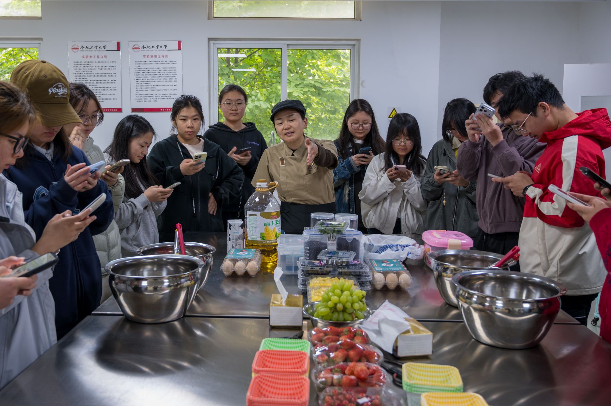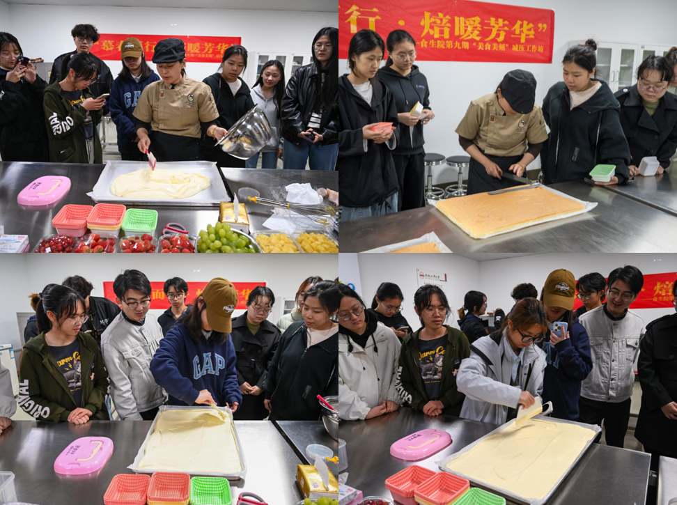随后,参与同学前往翡翠湖校区三号实验楼209室,正式进入蛋糕制作环节。在老师的指导下,大家分组协作,亲手制作蛋糕胚、准备水果、打发奶油、组装蛋糕,并用心完成裱花装饰。同学们在蛋糕的制作中,与自己内心的温柔对话,在协作中拉近了彼此的距离。参与同学纷纷表示,在亲手制作和分享甜点的过程中,不仅学到了实用的烘焙技巧,更收获了与伙伴们交流的美好时光。