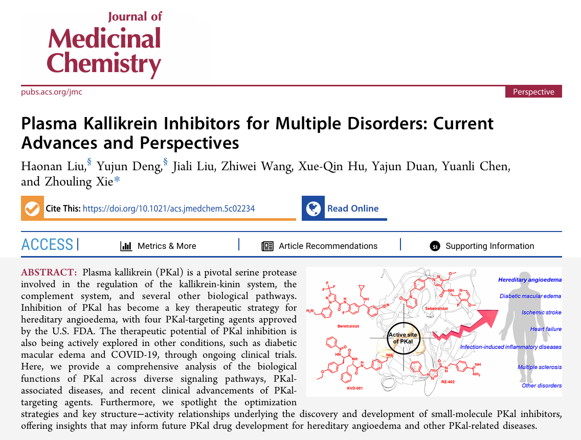 近日,合肥工业大学食品与生物工程学院药学专业24级本科生刘浩南在谢周令副教授的指导下,以第一作者的身份在著名药学学术期刊《Journal of Medicinal Chemistry》(一区)上发表题为《Plasma Kallikrein Inhibitors for Multiple Disorders: Current Advances and Perspectives》的综述文章。合肥工业大学为唯一通讯单位。血浆激肽释放酶(PKal)是一种关键的丝氨酸蛋白酶,参与激肽释放酶-激肽系统、补体系统以及多条生物通路...